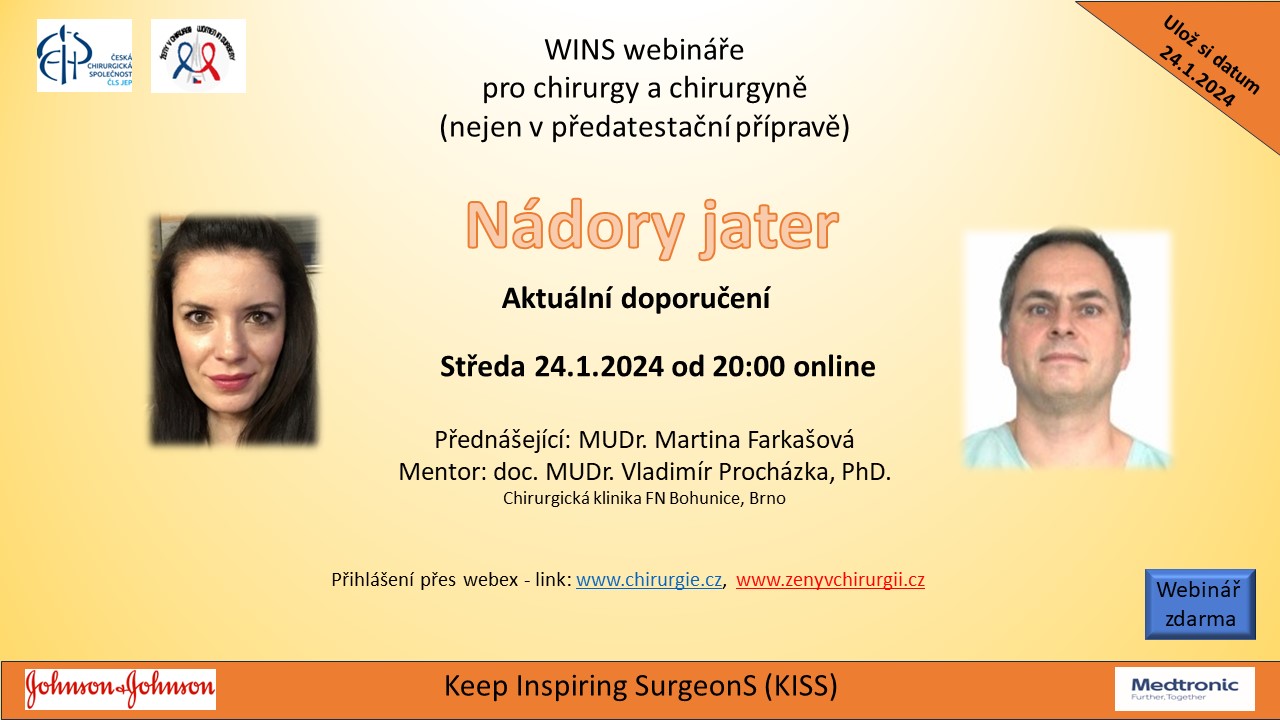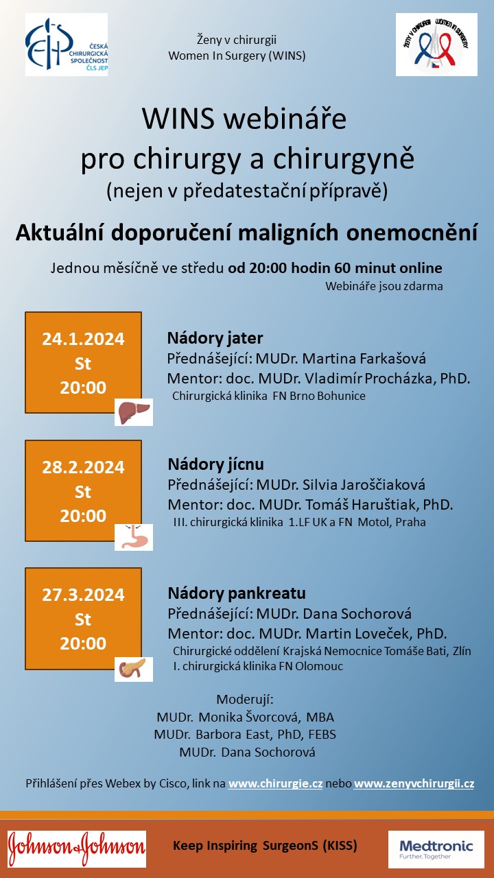 Tyto webináře jsou určeny zejména pro mladé chirurgy a chirurgyně v předkmenové a předatestační přípravě, ale také pro všechny, kteří se o tuto problematiku zajímají nebo si jí chtějí jen připomenout. Série webinářů bude nadále probíhat jedenkrát měsíčně, vždy ve středu, od 20 : 00 hodin, on-line. Přesná data a témata jsou shrnuta níže stejně jako pozvánka ke stažení. Každý webinář bude připraven jedním přednášejícím a jedním mentorem. Přihlášení bude možné prostřednictvím odkazu prostřednictvím webex by cisco company, s předstihem před začátkem jednotlivých webinářů.