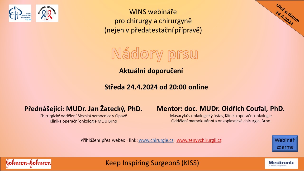 NÁDORY PRSU středa 24. 4. 2024, 20 : 00 Přednášející: MUDr. Jan Žatecký, PhD. Chirurgické oddělení Slezská nemocnice, Opava Mentor: doc. MUDr. Oldřich Coufal, PhD. Masarykův onkologický ústav, Brno Přihlášení na tento webinář: veškeré instrukce viz níže. Pozvánka je ke stažení zde