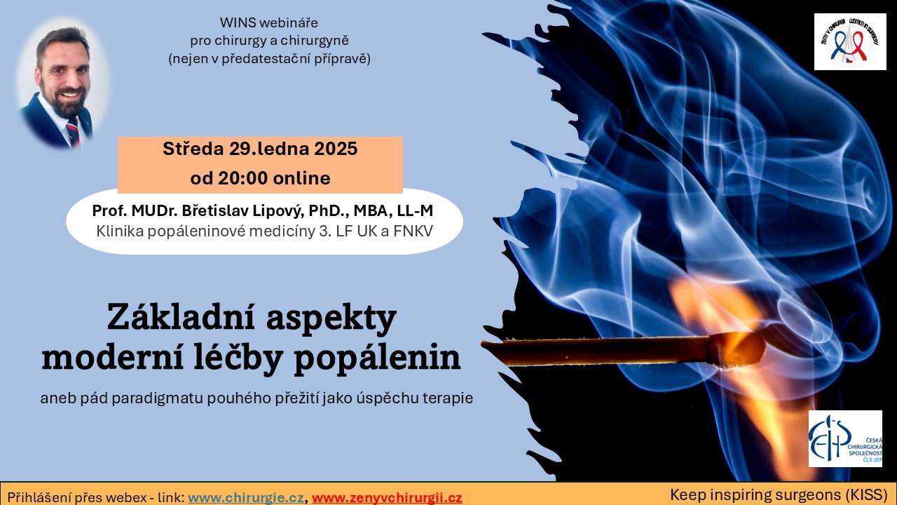 ZÁKLADNÍ ASPEKTY MODERNÍ LÉČBY POPÁLENIN středa 29. 1. 2025, 20 : 00 Přednášející: prof. MUDr. Břetislav Lipový, Ph.D., MBA, LL.M. FN Královské Vinohrady Klinika popáleninové medicíny Přihlášení na tento webinář: veškeré instrukce viz níže. Pozvánka je ke stažení zde