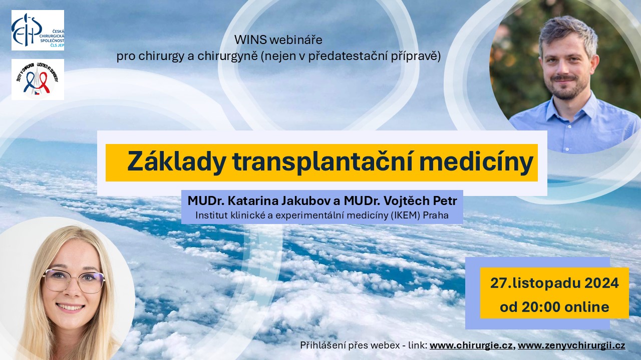 po loňské úspěšné sérii WINS webinářů si Vás dovolujeme pozvat na druhou sérii těchto WINS webinářů, které jsou plánované v akademickém roce 2024/2025. Webináře jsou primárně věnované mladým chirurgům a chirurgyním v předatestační přípravě, ale současně také všem, kteří se o danou problematiku zajímají.