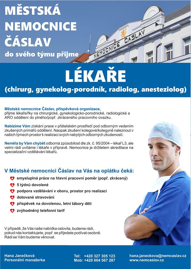 dovolujeme si Vás informovat, že Městská nemocnice Čáslav, příspěvková organizace, přijme lékaře/lékařku na chirurgické oddělení do plného/popř. zkráceného pracovního úvazku. Nabízíme Vám získání praxe v přátelském prostředí pod odborným vedením zkušených lékařů a primářů oddělení. Naopak zkušení kolegové/kolegyně naleznou v našich týmech prostor k realizaci svých nabytých odborných zkušeností.